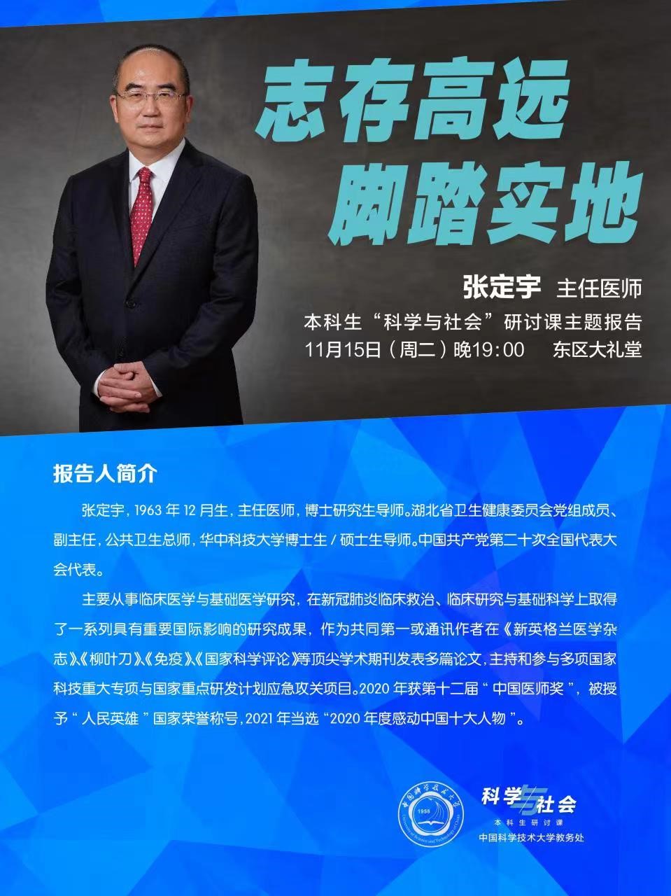 11月15日晚7:00,贝博2022级本科生“科学与社会”研讨课第二场主题报告将在东区大礼堂举行,特邀“人民英雄”国家荣誉称号获得者张定宇主任医师做相关主题演讲,欢迎广大师生积极参加。