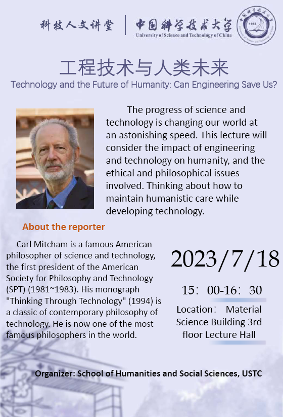 作为“科技人文讲堂”系列报告会之一,世界著名科技哲学家Carl Mitcham教授将来贝博做学术报告。欢迎全校感兴趣的师生参加。