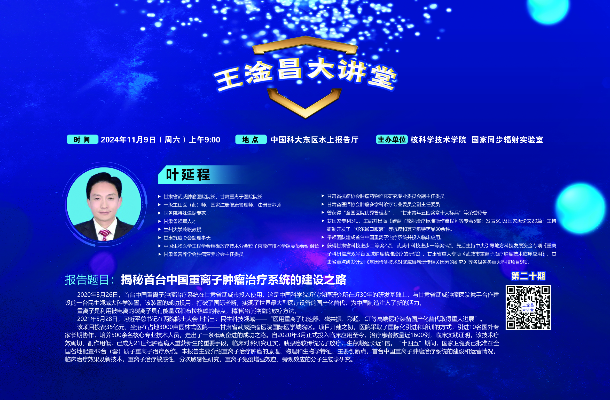 “王淦昌大讲堂”为核科学技术学院、国家同步辐射实验室主办的系列报告会,本次大讲堂特邀甘肃省武威肿瘤医院院长,甘肃重离子医院院长,甘肃抗癌协会副理事长,一级主任医师叶延程教授来贝博做报告。