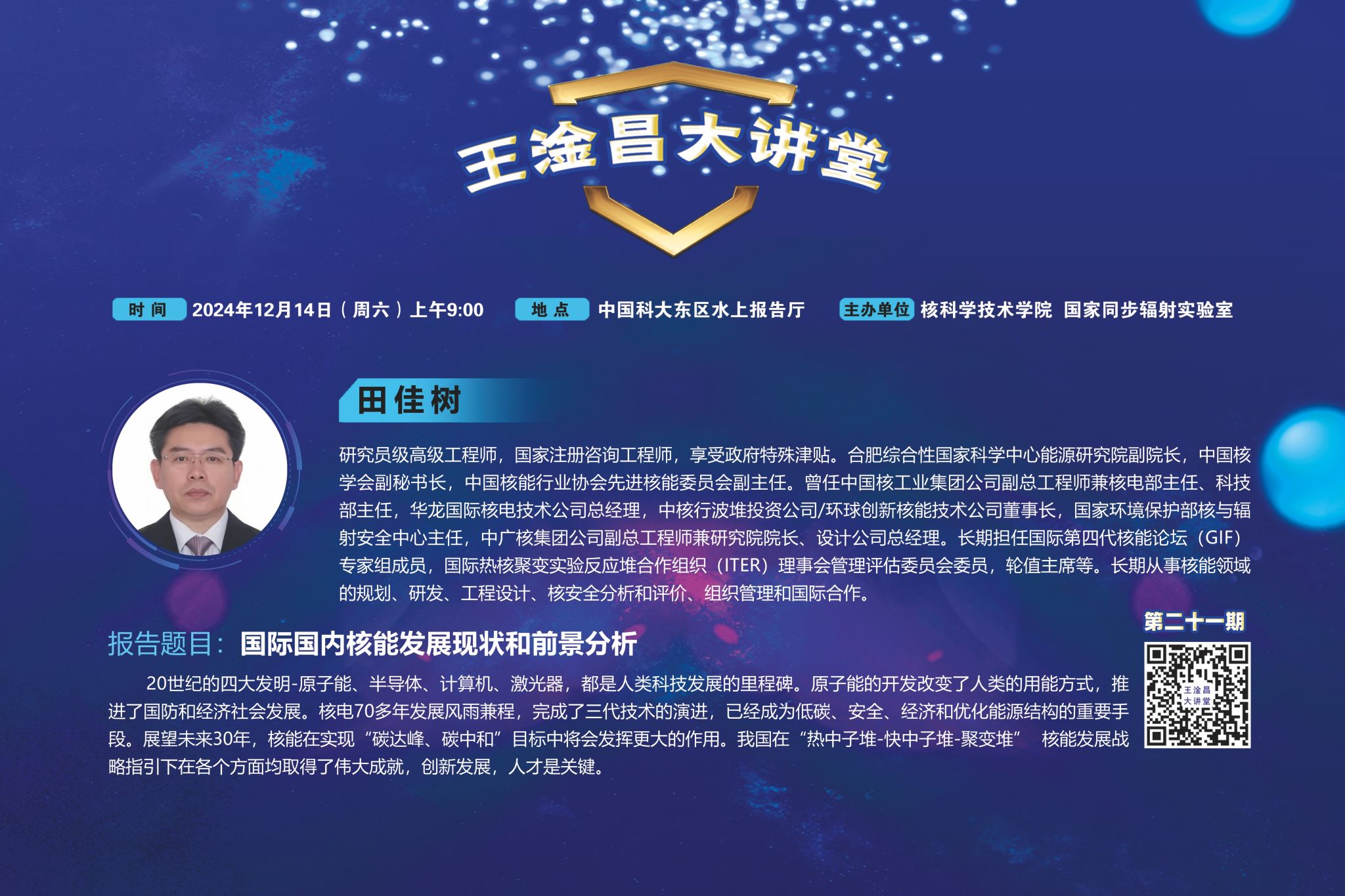 王淦昌大讲堂”为核科学技术学院、国家同步辐射实验室主办的系列报告会,本次大讲堂特邀合肥综合性国家科学中心能源研究院副院长,中国核学会副秘书长,中国核能行业协会先进核能委员会副主任田佳树研究员级高级工程师来贝博做报告。