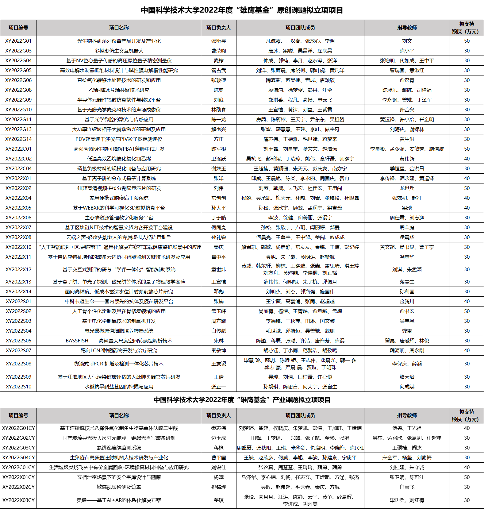 附件2:中国科学技术大学2022年度“雄鹰基金”拟立项项目