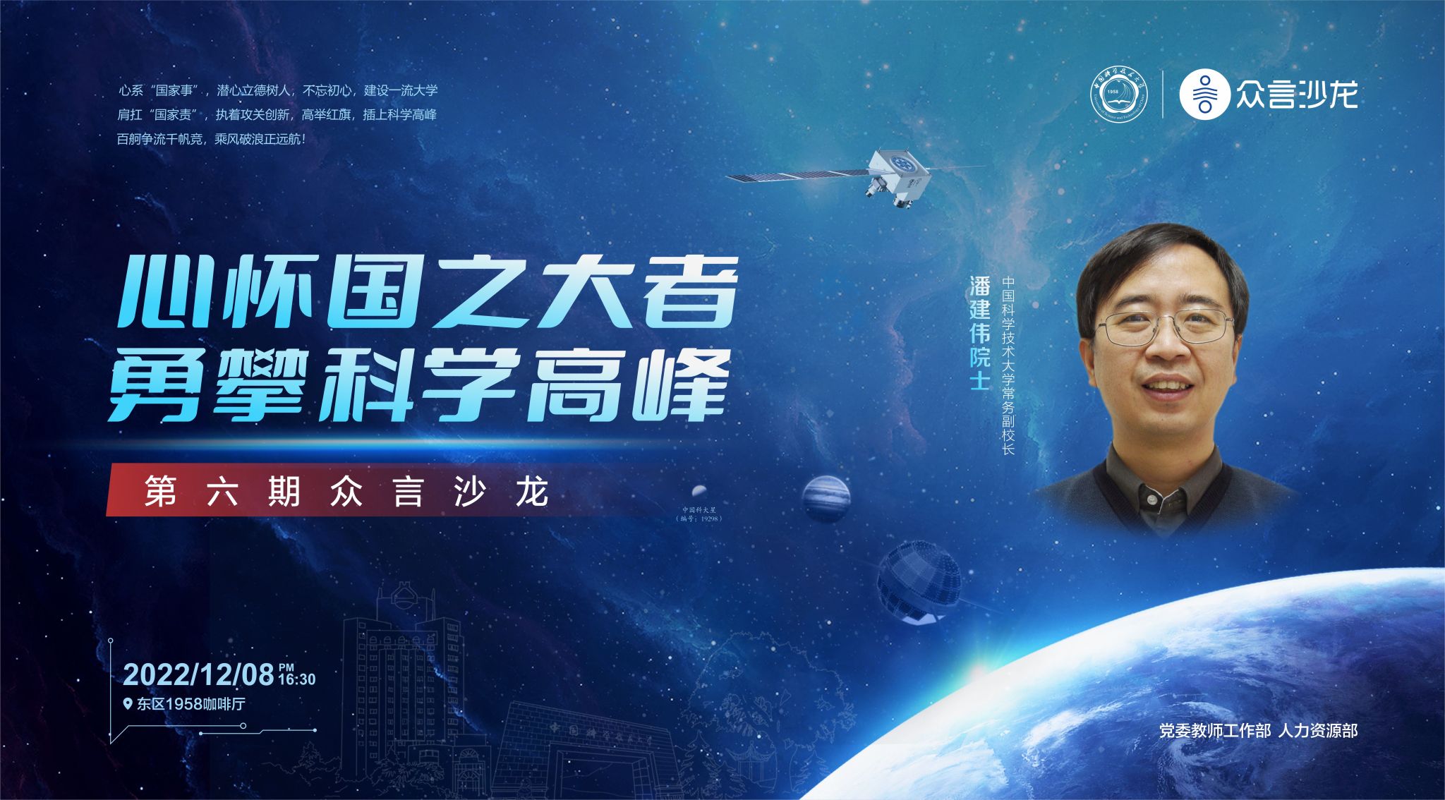 第六期众言沙龙活动将以“心怀国之大者 勇攀科学高峰”为主题,邀请潘建伟院士与教师进行面对面交流,搭建沟通平台,助力教师成长。活动定于12月8日(周四)下午4:30在东区1958咖啡厅开展,报名链接:https://www.wjx.cn/vm/w7F1ya0.aspx#,诚挚欢迎感兴趣教师报名参加!报名通过者将另行发送通知,欲报从速。