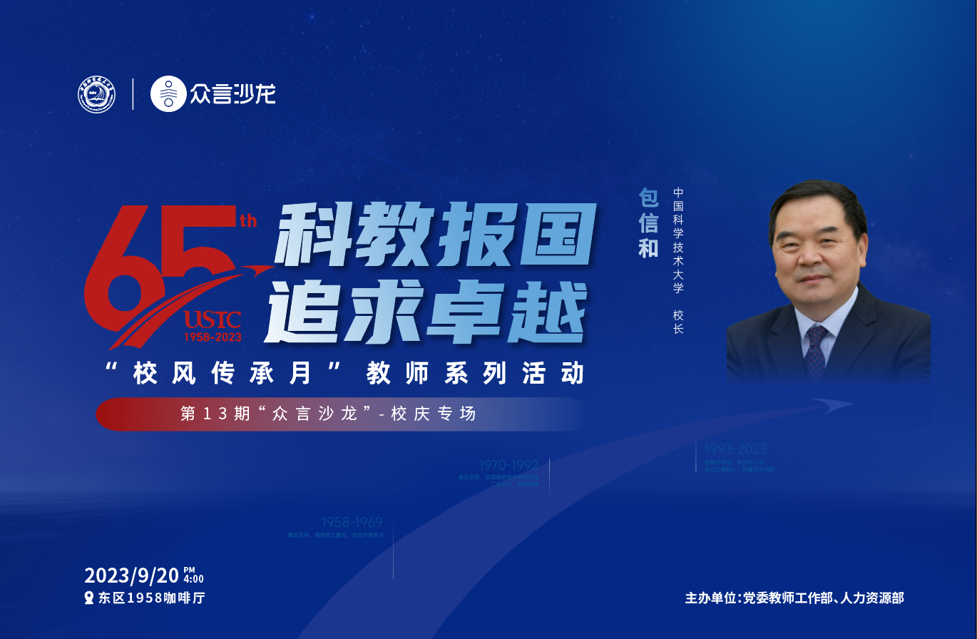 9月20日是贝博ballbet艾弗森建校65周年校庆日,作为中国科学技术大学校风传承月教师系列活动之一,第13期众言沙龙将以“科教报国,追求卓越”为主题举办校庆专场活动,邀请校长包信和作为嘉宾,与教职工代表进行面对面交流。