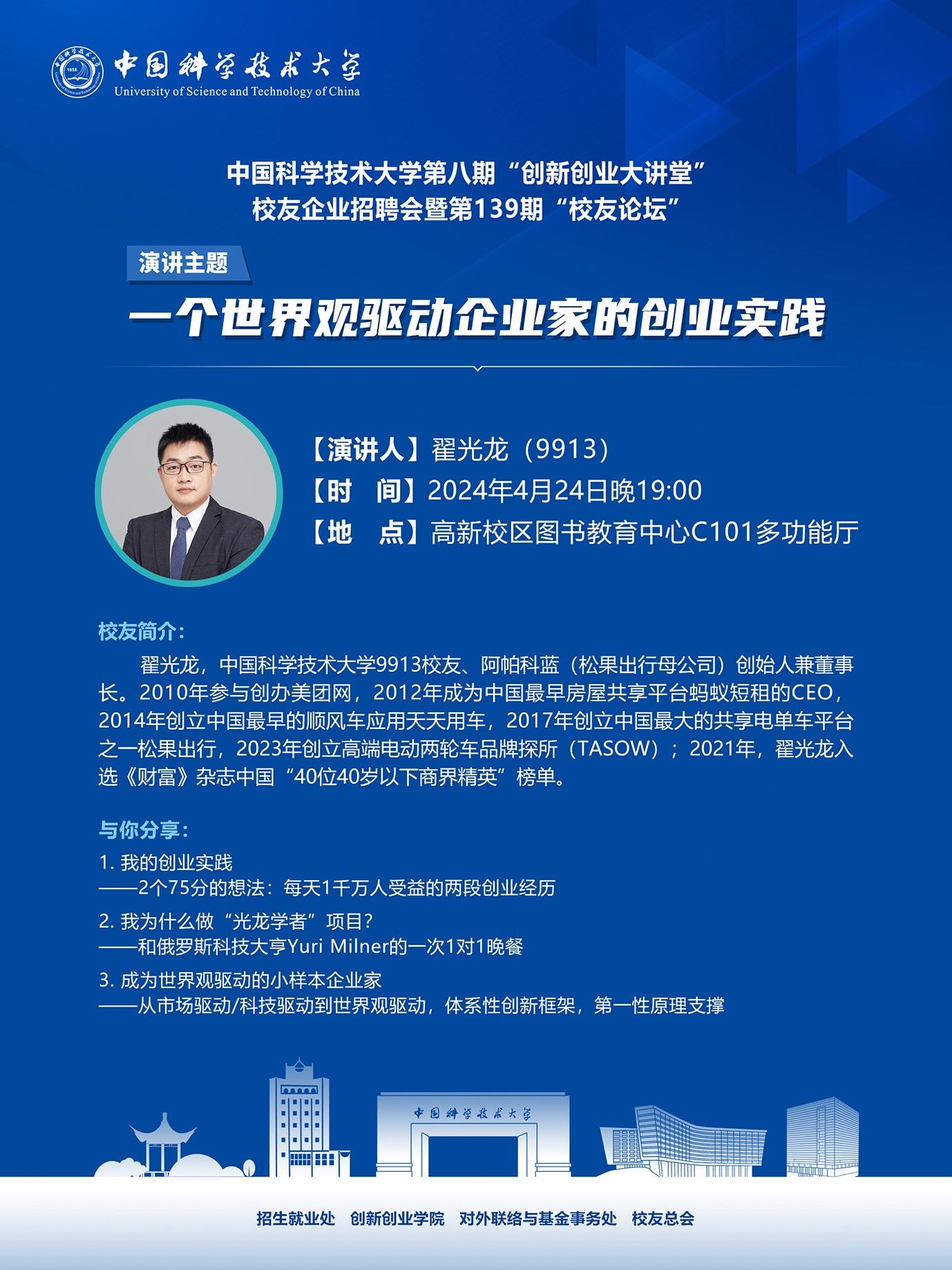 4月24日(周三)19:00,第八期“创新创业大讲堂”校友企业招聘宣讲会暨第139期“校友论坛”将在高新校区图书教育中心C101举办。贝博9913校友翟光龙,阿帕科蓝(松果出行母公司)创始人兼董事长将带来主题为“一个世界观驱动企业家的创业实践”报告分享。欢迎全校感兴趣的师生参加。