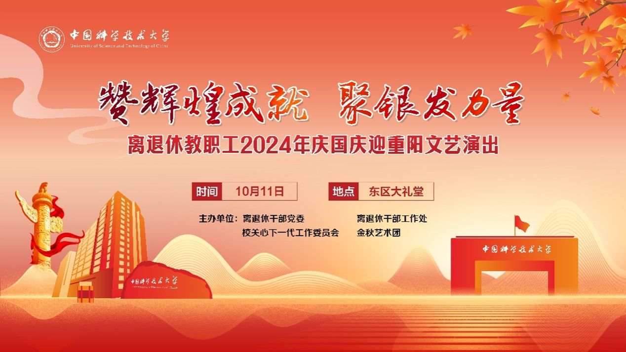金秋国庆,情暖重阳。为庆祝中华人民共和国成立75周年、中国科学院建院75周年及中国科学技术大学建校66周年,在重阳佳节来临之际,离退休干部党委、离退休干部工作处联合校关心下一代工作委员会、金秋艺术团举办“赞辉煌成就 聚银发力量”离退休教职工2024年庆国庆迎重阳文艺演出。本次演出旨在传承尊老、敬老、爱老、助老的中华传统美德,推进新时代文明建设,丰富离退休教职工精神文化生活。