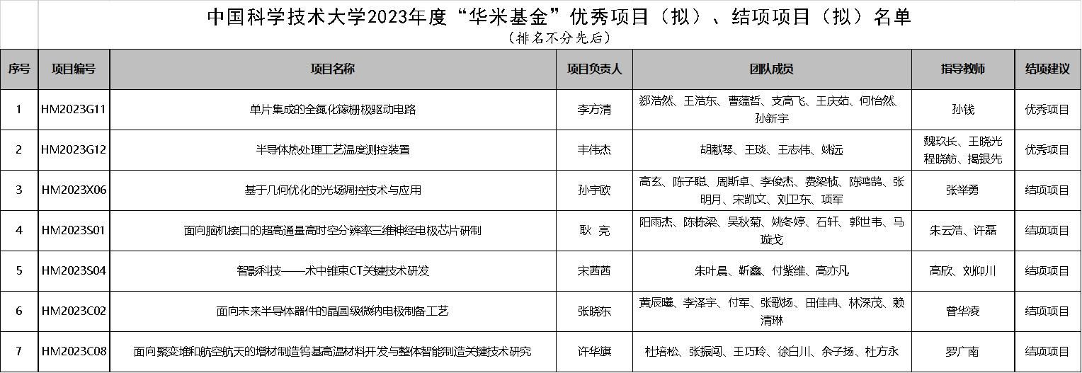 根据工作安排,中国科学技术大学2023年度“华米基金”立项项目经过项目总结、成果复核、管理委员会评审等环节,确定“基于几何优化的光场调控技术与应用”等7个项目作为2023年度“华米基金”结项项目(拟),其中,“单片集成的全氮化镓栅极驱动电路”等2个项目被评为2023年度“华米基金”优秀项目(拟),详见附件。