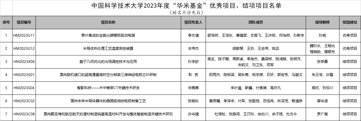 根据工作安排,中国科学技术大学2023年度“华米基金”立项项目经过项目总结、成果复核、专家评审和结项公示等环节,确定“基于几何优化的光场调控技术与应用”等7个项目作为2023年度“华米基金”结项项目,其中,“单片集成的全氮化镓栅极驱动电路”等2个项目(详见附件)被评为2023年度“华米基金”优秀项目,特此通知。