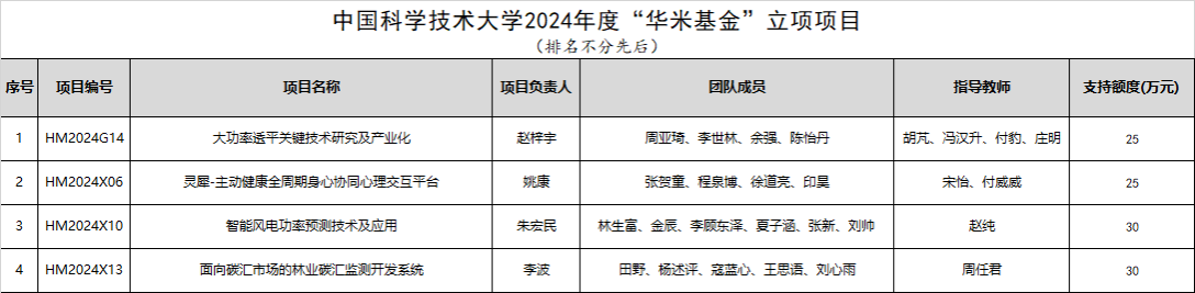 根据工作安排,中国科学技术大学2024年度“华米基金”经过项目申报、资格审查、尽职调查、投票表决、预立项公示、预立项等环节,确定“大功率透平关键技术研究及产业化”等4个项目(详见附件)为2024年度“华米基金”立项项目,予以资助,特此通知。