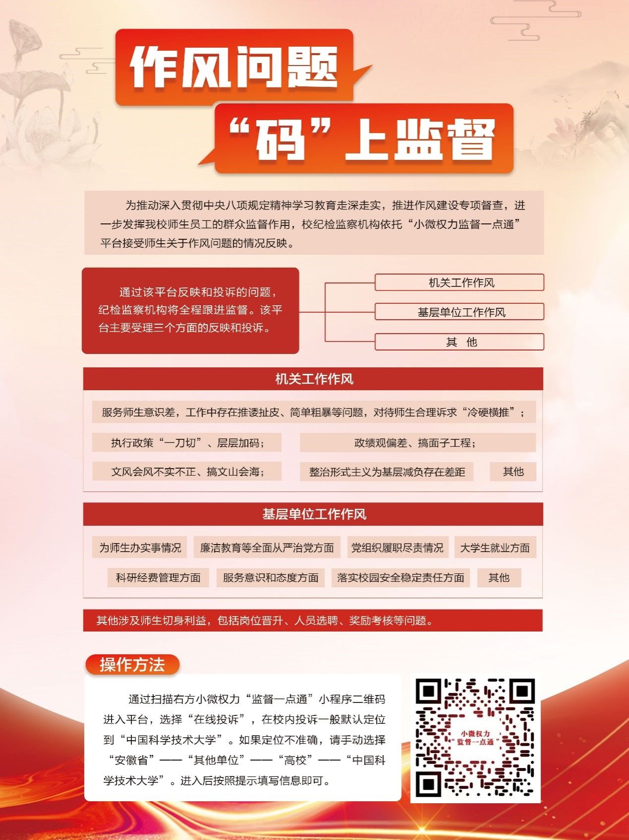 为推动深入贯彻中央八项规定精神学习教育走深走实,推进作风建设专项督查,进一步发挥贝博师生员工的群众监督作用,校纪检监察机构依托中央纪委国家监委主管、安徽省纪委监委主办的“小微权力监督一点通”平台接受师生关于作风问题的情况反映。