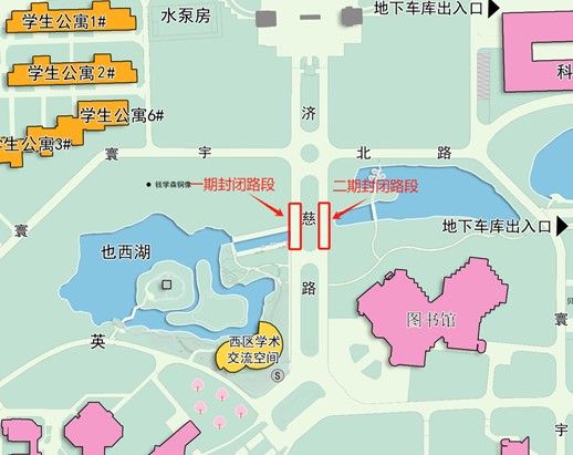 根据学校相关工作安排,需对西区济慈路路段封闭施工,交叉封闭先封西侧路段,计划于2025797:00-857:00对道路临时封闭进行中塘与也西湖水系连通(具体封闭范围见附图),过往车辆及人员请绕行,给广大师生带来的不便,敬请谅解。(如遇特殊情况,施工时间弹性调整并另行告知)