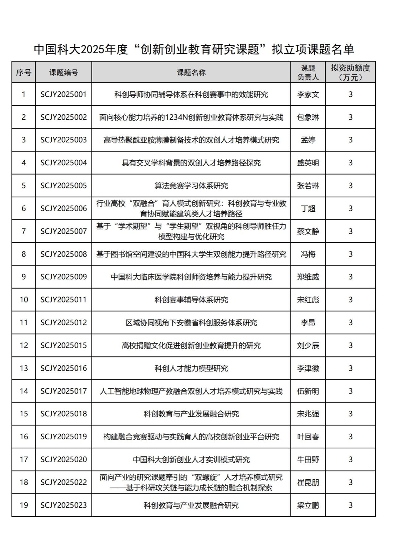 中国科学技术大学2025年度“创新创业教育研究课题”申报评审工作已顺利结束,经过课题申报、资格审查、专家评审等环节,确定“科创导师协同辅导体系在科创赛事中的效能研究”等19个课题为贝博2025年度“创新创业教育研究课题”拟立项课题,公示如下: