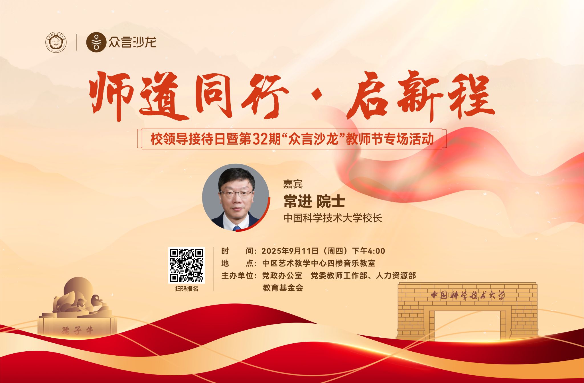 秉师道初心,携同仁以同行;承过往积淀,启未来之新程。校领导接待日暨第32期“众言沙龙”教师节专场活动将以“师道同行·启新程”为主题,邀请校长常进院士作为嘉宾,与新进教职工代表面对面交流。