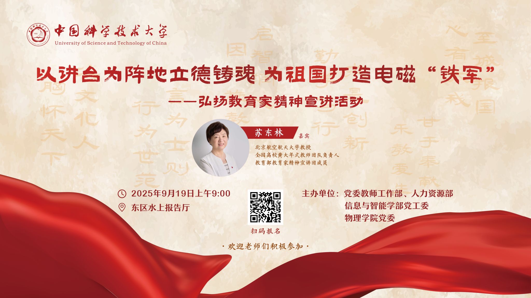 宣讲嘉宾简介:苏东林,教育部教育家精神宣讲团成员,北京航空航天大学教授,全国高校黄大年式教师团队负责人,带领团队获2024年全国最美教师团队。长期致力于电磁兼容基础理论研究、关键技术攻关、重大装备研制。先后主持完成了30多项重大装备电磁兼容工程任务,以第一完成人获国家技术发明一等奖1项、国家科技进步二等奖2项。享受国务院政府津贴,获全国巾帼建功标兵、全国五一劳动奖章、全国创新争先奖、何梁何利基金科学与进步奖、第四届杰出教学奖等。