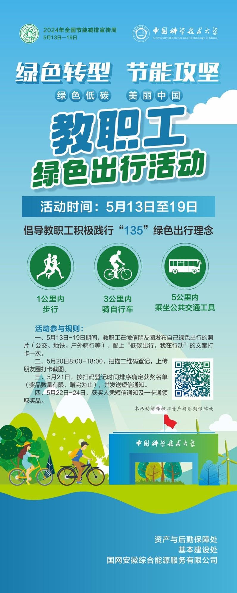 活动内容:倡导教职工积极践行“135”绿色出行理念(即1公里内步行,3公里内骑自行车,5公里内乘坐公共交通工具)。活动期间,教职工在微信朋友圈发布自己绿色出行的照片(公交、地铁、户外骑行等),配上“低碳出行,我在行动”的文案打卡一次,即可有机会获得奖品一份(参与方式见附图)。