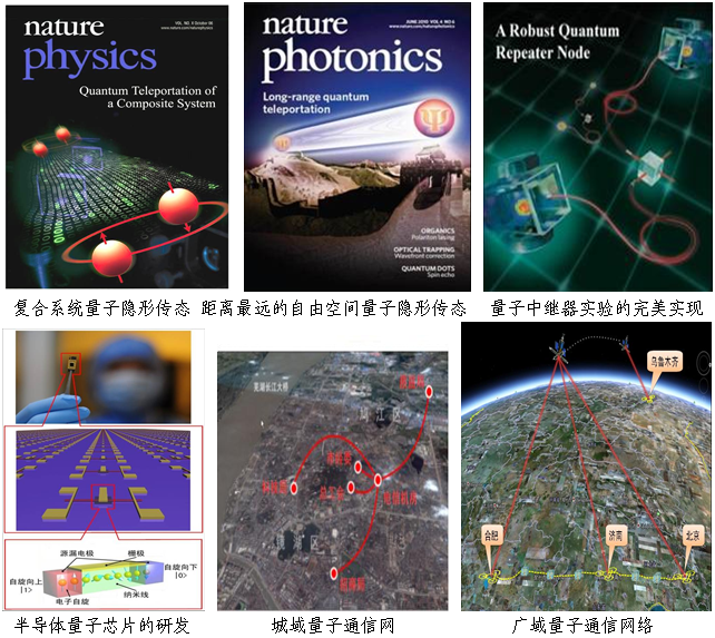 上世纪80年代率先在国内开展量子光学研究,于1997年和1998年先后提出“量子避错编码原理”和“量子概率克隆原理”。在近十年中,学校在量子信息科学前沿和量子通信技术等领域取得了一系列具有国际领先水平的创新成果。首次实现终端开放的隐形传态、复合系统量子隐形传态、光子与原子比特间的隐形传态、国际上距离最远的自由空间量子隐形传态;首次实现五光子、六光子和十比特光子纠缠态;首次实现突破大气等效厚度的量子纠缠和量子密钥分发;率先实现绝对安全距离超过100公里和200公里的诱骗态量子密钥分发;首次实现全通型量子通信网络;首次实现具有存储和读出功能的量子中继器;实现毫秒级的单激发量子存储;实现多光子容失量子编码;实现重要的量子算法;实现自旋晶格模型中任意子分数统计的量子模拟;实现最优动力学解耦,极大地提高了电子自旋相干时间等。在量子技术创新与工程化应用方面取得了重大突破,成功研制出具有国际领先水平的单光子探测器、量子密钥收发一体终端、量子交换机和量子集控站等一批核心元器件与关键设备。目前正联合安徽省和山东省相关地区,开展“南北干线”大尺度光纤量子通信骨干网建设,有望建成世界上首个大尺度广域量子通信国家试验床,对我国夺取这一战略性新兴产业的制高点具有十分重大的意义。