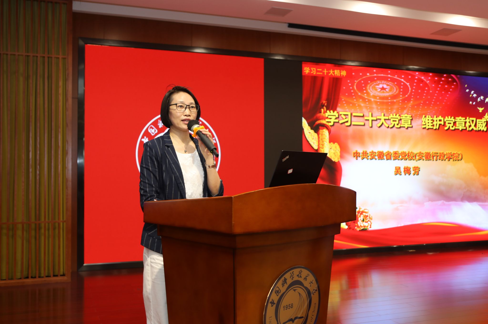 7月6日上午,校党委理论学习中心组在东活五楼报告厅围绕“学习党章党规,弘扬伟大建党精神”(专题五),举办学习贯彻习近平新时代中国特色社会主义思想主题教育专题报告会。安徽省委党校(安徽行政学院)教授吴梅芳受邀作题为《学习党的二十大党章 维护党章权威》的辅导报告。中央第五十四指导组组长靳诺出席会议报告会,校党委书记舒歌群主持报告会,在校校领导,党委委员、纪委委员,机关党群部门主要负责人,院级党组织主要负责人参加报告会。