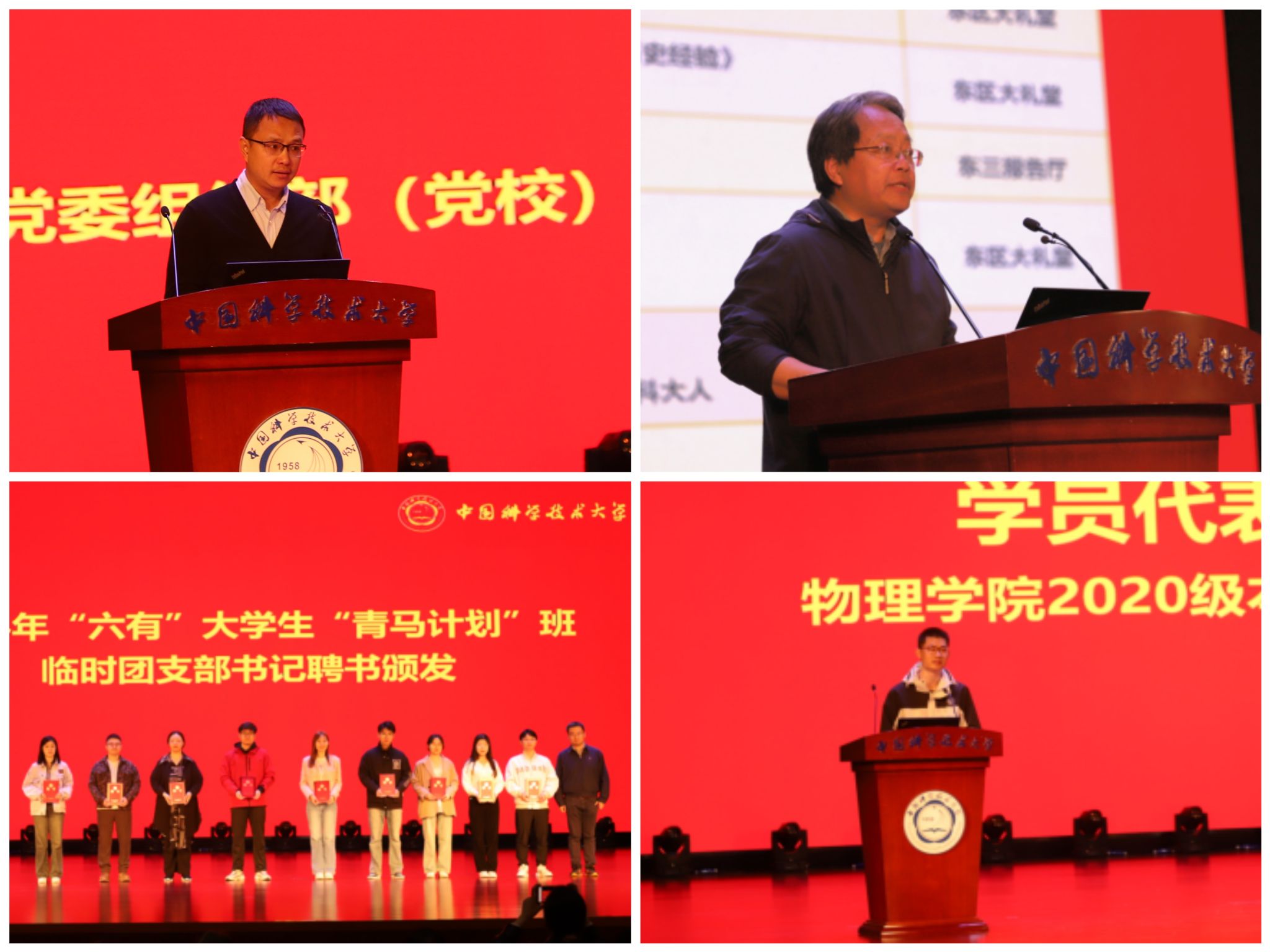 物理学院党委书记陈向军、校团委书记千坤分别介绍了本次入党积极分子示范培训班和青马班的相关课程安排。物理学院2020级本科生刘谨鸣作为培训班学员代表发言,他承诺要成为新时代坚定的青年马克思主义者,展现青年的担当与责任,为实现中华民族的伟大复兴积蓄后备力量。千坤为青马班各临时团支部选举产生的支部书记颁发聘书。