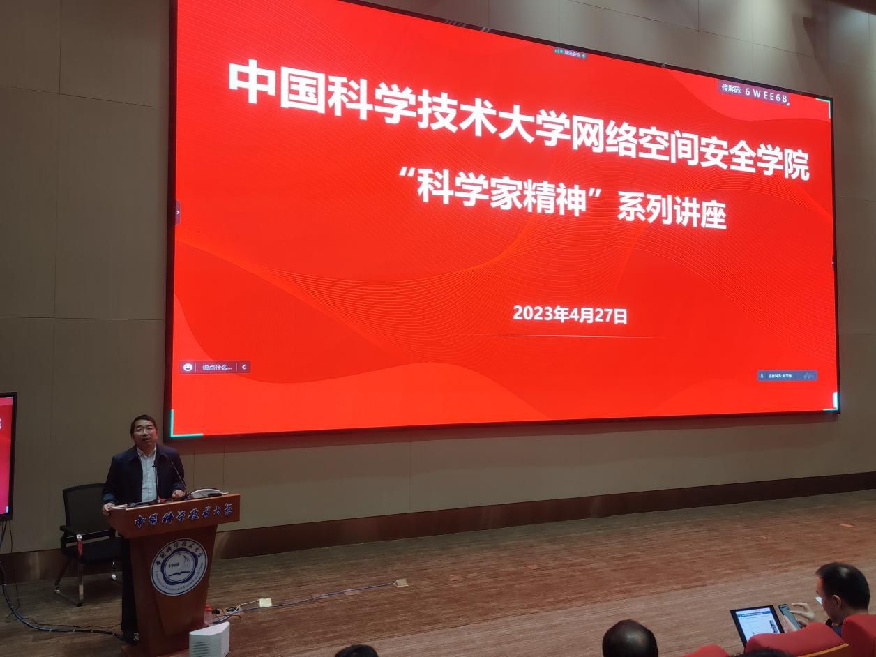 4月27日下午,网络空间安全学院围绕“坚定理想信念,传承科学家精神”主题,在高新区图书馆C座GT-C103开展学习贯彻习近平新时代中国特色社会主义思想主题教育第一次专题学习会暨学习“科学家精神”系列讲座。中国科学院软件研究所副主任研究员苏璞睿、副研究员程亮、网络空间安全学院党总支书记谭勇、执行院长俞能海、副院长张卫明、学院各党支部书记、支委、党员代表,以及400余名学生参加主题教育和讲座。