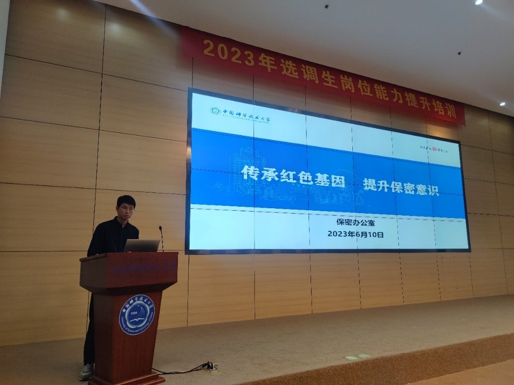 保密办公室韦晓琪作主题为“传承红色基因 提升保密意识 ”的保密教育报告。韦老师向同学们介绍了保密工作形势、工作常识、工作渠道等内容,并结合目前的国际形势变化,向同学们深入阐明了做好保密工作的重要意义。