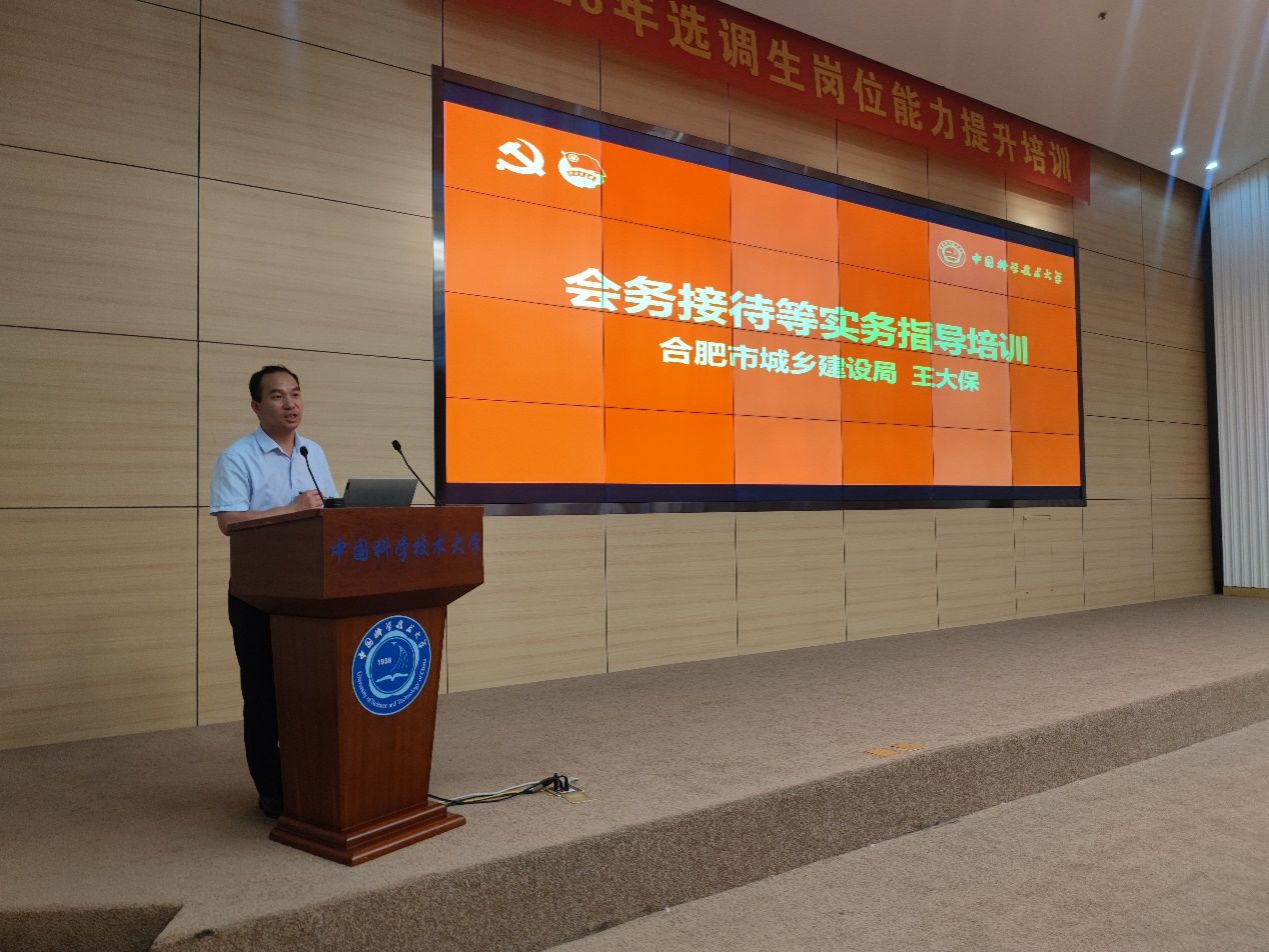 在会务接待实务指导培训环节,合肥市城乡建设局办公室主任王大保从自身经历出发,向同学们讲解了组织筹办不同规格会议时需要注意的工作要点以及面对紧急复杂问题时的处置方式。王大保主任希望同学们在今后的工作中能够做到细心筹划、周密部署,从而切实提升自己办事办会的能力与水平。