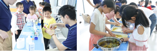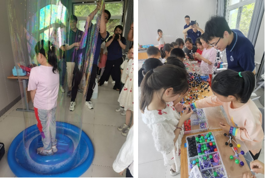 化学与材料科学学院、工程科学学院、生命科学与医学部的老师及学生志愿者为50余名学生带来了分子模型搭建、神奇泡泡、热缩片、碟中惊变、叶脉书签、橡皮筋动力小鸟、机器狗等科技互动活动。通过生动有趣的游戏,向学生们讲解其中的科学原理与奥秘,在锻炼他们动手能力的同时,激发他们对科学的求知欲,直观感受科学的美丽与魅力。