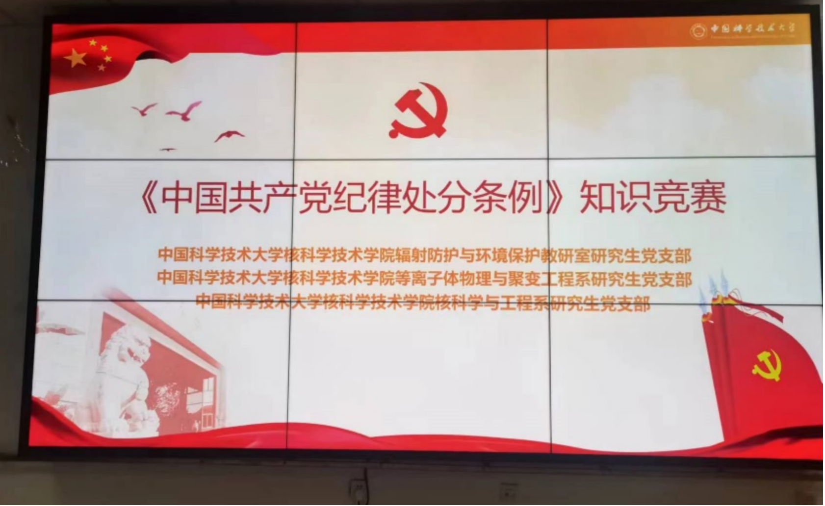 7月2日,为深入学习贯彻党的二十大精神,学习贯彻落实《中国共产党章程》《中国共产党纪律处分条例》,加强学生党员党性修养,做到学纪、知纪、明纪、守纪,中国科学技术大学核科学技术学院辐射防护与环境保护教研室研究生党支部、等离子体物理与聚变工程系研究生党支部、核科学与工程系研究生党支部在西区科技实验楼1617会议室联合举办主题为“ 以赛促学,以学促行 ”的《中国共产党纪律处分条例》知识竞赛活动。本活动由核科学技术学院核科学与工程系研究生党支部书记王傲寒主持。