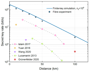 潘建伟、徐飞虎研究组发展了集成光子片上高速高保真度偏振态调制技术,系统重频达到2.5 GHz,量子比特误码率优于0.35%;结合中科院上海微系统所尤立星团队最新研制的八像素SNSPD,实现了高计数率、高效率的单光子探测,在每秒输入5.5亿个光子时仍能保持62%的探测效率;同时,研究组发展了偏振反馈控制、高速后处理模块等。在上述技术突破的基础上,研究团队实现了10公里标准光纤信道下115.8 Mb/s的密钥率,较之前纪录提高了约一个数量级;系统稳定运行超过50个小时,在传输距离328公里下码率超过200b/s。上述研究成果表明,QKD可实现百兆比特率的实时密钥分发,满足高带宽通信需求,对未来量子通信的大规模实际应用具有重要意义。