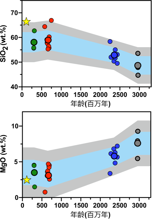 图2 基于冰碛岩V同位素计算得到的SiO2和MgO含量与时间关系图