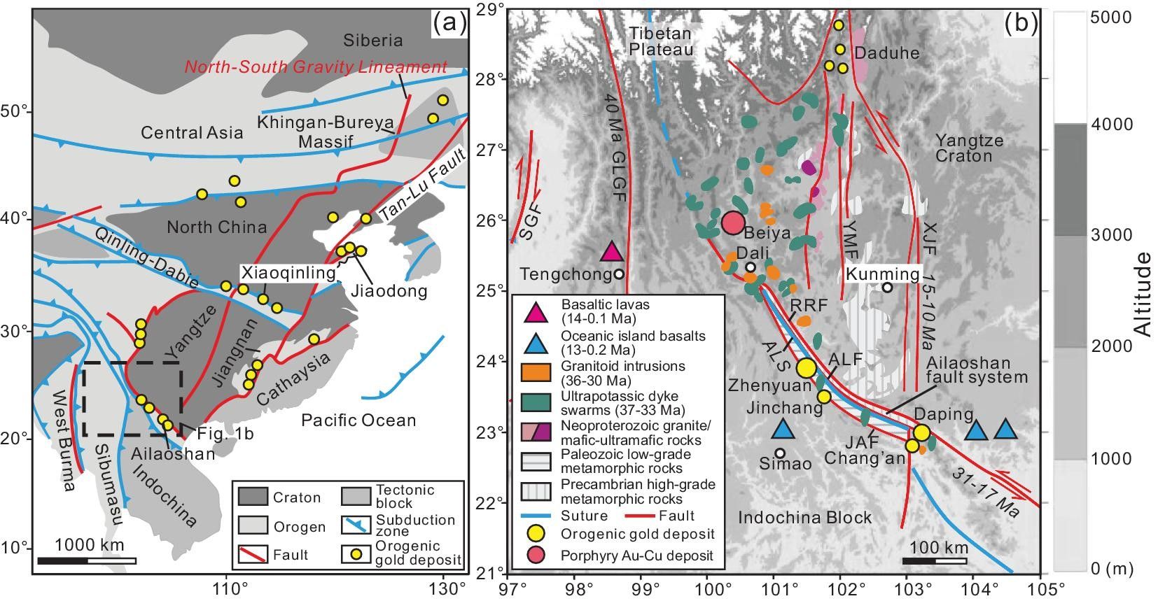 造山型金矿约占全球金矿资源30%,但是其成矿机理还存在争议。此类金矿之前常被认为广泛发育于前寒武纪绿岩带中,它们的含金流体被认为是由进变质过程中地壳岩石脱水产生。然而,越来越多的证据表明,太古代克拉通边缘存在大量显生宙造山型金矿,成矿流体显示大量地幔来源的特征。研究团队选择位于青藏高原东南部的扬子克拉通西缘哀牢山造山型金矿带(图1)为例,综合多种地球物理和地球化学手段,开展了造山型金矿带成矿机制研究。