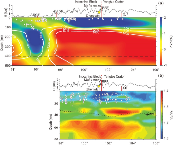 图2 沿24°N剖面的(a)地幔Vp和(b)岩石圈Vp/Vs的变化。(a)中的红色低速区表示上涌的软流圈热物质;(b)中莫霍面(以虚线表示)上下的高Vp/Vs区域为部分熔融。