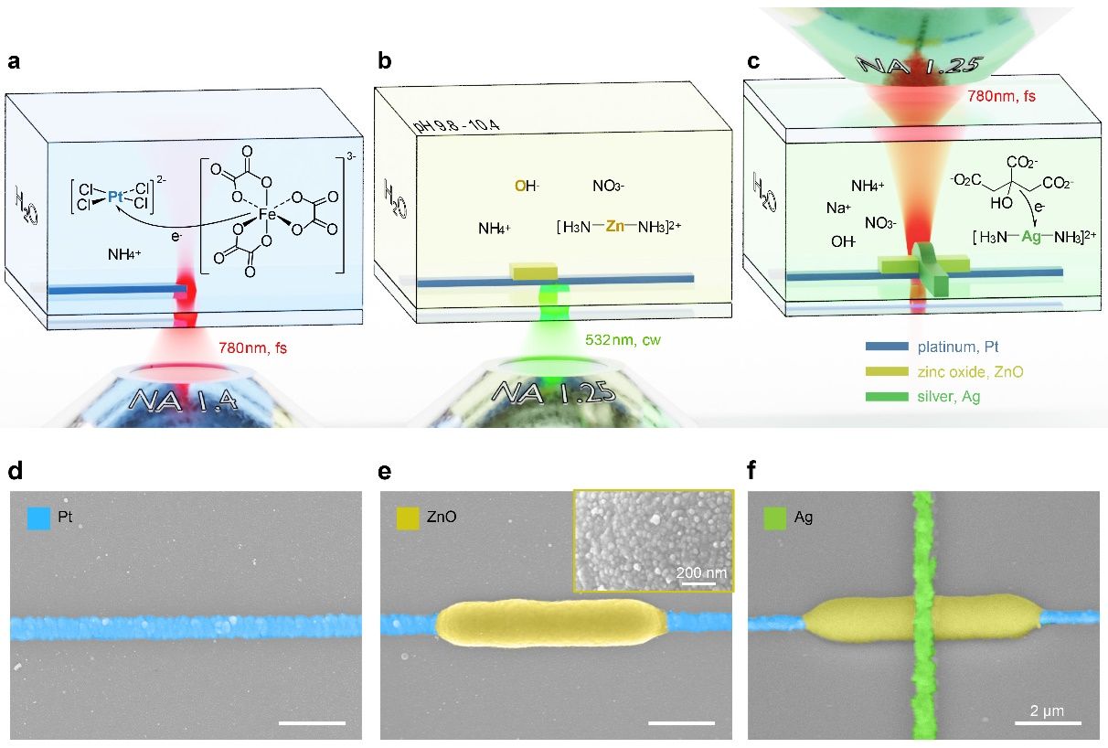 图1:金属/半导体材料激光复合打印。a,d:金属铂;b,e:氧化锌半导体; c,f:金属银。