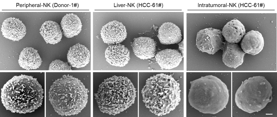 图1 外周血和肝脏组织来源的正常NK细胞表面呈现丰富的膜凸起(左、中),而肿瘤组织微环境NK细胞表面异常光滑,膜凸起丢失(右)。