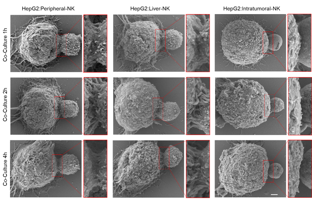 图2外周血和肝脏组织来源的正常NK细胞利用膜突起与肿瘤细胞形成“免疫突触”结构(左、中),而肿瘤组织微环境NK细胞缺失膜突起,未能形成(右)。