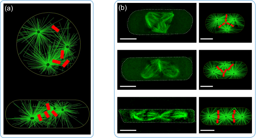 图3:四面受限的力学环境改变细胞形状,进而调控纺锤体的劈裂与合并行为。(a)计算模拟四面受限的力学环境调控纺锤体的劈裂与合并行为。(b)不同受限程度的三极纺锤体构型的实验结果(左)和计算模拟(右)对比。比例尺为10微米。