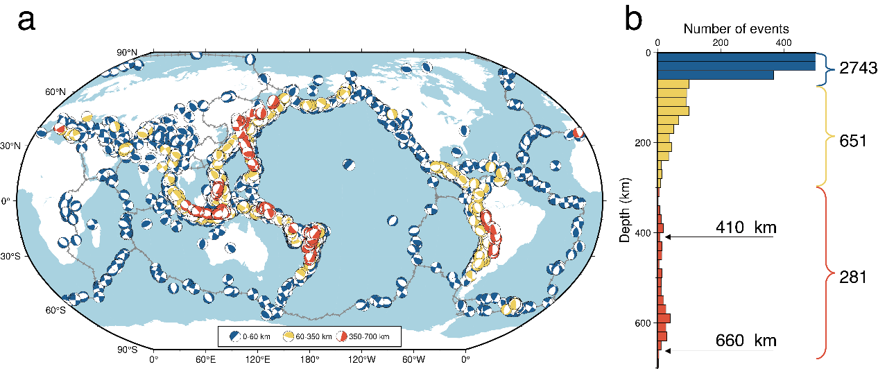 深地震是指震源深度超过60公里的地震。由于地球深处高温高压,岩石表现出塑性形变,深地震的产生机制与浅地震的脆性破裂有所不同。关于深地震成因有许多猜想,如脱水脆化、热失稳和亚稳态橄榄石相变等,但至今仍没有定论。了解深地震的成因和破裂过程有助于我们更好地理解地震的物理机制、俯冲带的性质以及地球内部的动力过程。长久以来,地震学家通过分析震源时间函数,发现浅地震(0-60 km)、中源地震(60-300 km)和深源地震(300-700 km)具有不同的破裂特征,并根据这些差异推断深地震可能的产生机制。