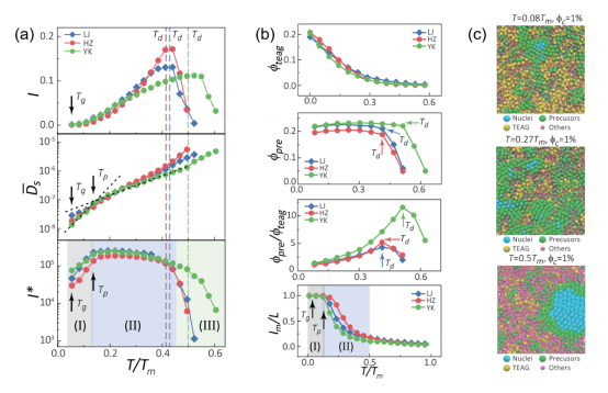 徐宁教授和谭鹏教授的合作团队运用分子动力学模拟,细致深入地探讨了“低温”区间的早期成核过程,发现了两个特征温度,这两个温度把整个温度区间划分为三个部分。较高的特征温度Td对应于最大的成核速率,在高于该特征温度的温度区间内,成核主要以粒子扩散的模式发展演化。在低于Td的温度区间内,成核以非扩散的模式进行,结晶前驱体(晶体粒子的“前身”,局域结构较有序的粒子)的数量达到饱和,同时,二十面体结构随着温度的下降而增多,当达到较低的特征温度Tp的时候,二十面体结构形成逾渗,表明玻璃化开始阻碍成核。在Tp和玻璃化温度Tg之间,由于玻璃化的阻碍,成核速率随温度降低而快速下降,但是由于粒子的的振动仍然能够推动前驱体向晶体演化,结晶依旧可以缓慢进行。在低于Tg的温度区间,由于粒子的振动太弱,结晶在可观测的时间范围内几乎不再进行。该工作给出了迄今为止低温结晶最为完整和清晰的图像,表明最大成核速率是二十面体结构与前驱体之间平衡的结果,并且厘清了多种结构和动力学之间相互影响、相互竞争的复杂关系。