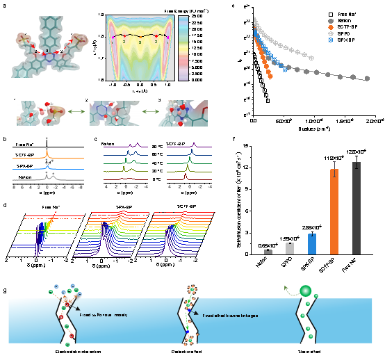 2.提出刚性微孔通道内“离子配位”机制。该研究团队在微孔框架离子膜中引入荷电基团和多种可以和离子发生弱相互作用的功能基团,利用静电作用、离子-偶极作用等相互协同,降低离子在膜内传递能垒(图3a)。固体核磁共振和PFG-NMR测试(图3b-3f)表明:Na+在膜内的自扩散系数达到1.18×10-5cm2/s,接近水溶液中Na+扩散系数(1.28×10-5cm2/s)和无限稀释Na+扩散系数(1.33×10-5cm2/s)。