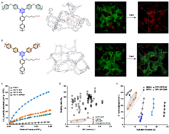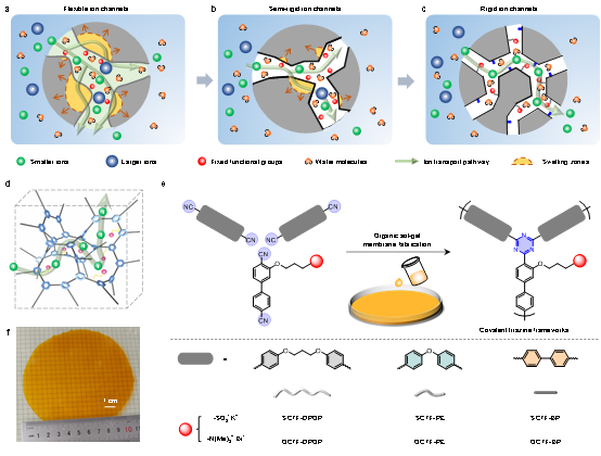 离子膜是水电解槽、燃料电池、氧化还原液流电池和离子捕获电渗析等相关过程的关键部件。离子在膜内的传递效率取决于离子跨膜的能垒,因此,在膜内构筑高效离子通道、降低离子跨膜传递能垒是开发高性能离子膜的关键。以美国杜邦公司Nafion膜为代表的“微相分离”离子膜具备尺寸宽的离子通道,能高效传导离子,但离子通道吸水后易溶胀,导致膜机械强度下降、选择性/阻隔性降低(图1a),因而适用于对选择性/阻隔性要求不高的应用。自具微孔离子膜通过半刚性高分子链无法有效堆叠而在膜内形成微孔通道(图1b),膜内微孔的尺寸筛分效应提高离子选择性、丰富的孔道提高小尺寸离子的传递效率;但膜内高分子链半刚性的特性可能导致自具微孔离子膜应用过程中的老化。因此,如何在膜内构筑全刚性限域微孔并调控离子与通道的相互作用,从而逼近离子传导速率的极限,是开发新一代离子膜的关键。
