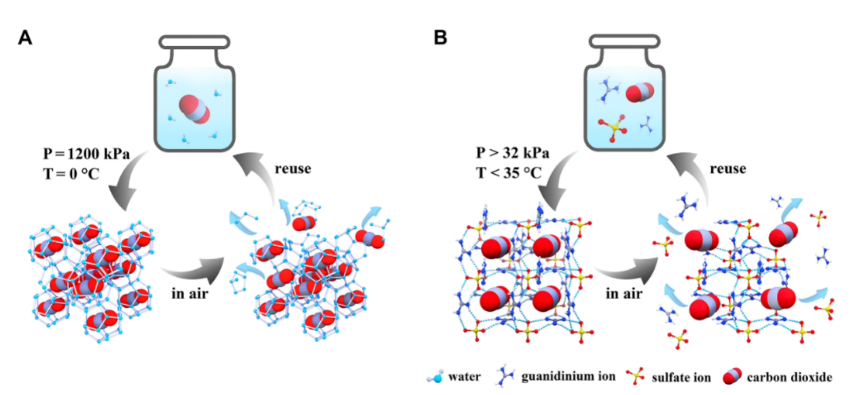 图1:(A) CO2水合物, CO2分子在高压低温条件下被包裹在水分子笼中。(B)基于硫酸胍的CO2包合物CO2@Gua2SO4,CO2可在低至32 kPa的压力和35 ℃及以下被捕获。两者都可以在环境温度压力条件自发释放CO2用于下一轮碳捕获。