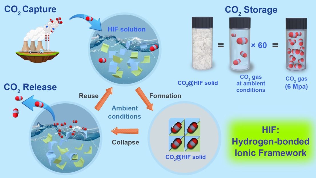 图2:基于硫酸胍氢键离子框架化合物(Hydrogen-bondedIonicFramework),常温常压超分子化学二氧化碳捕获全流程示意图。