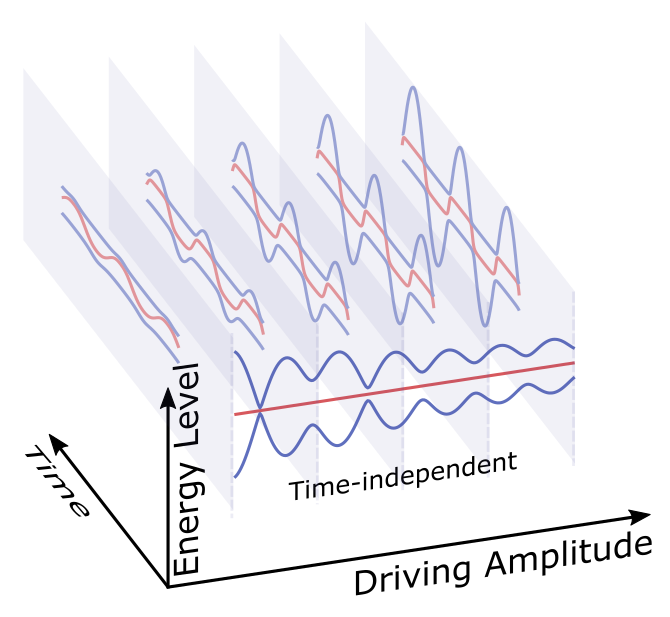为了研究驱动场对多能级系统的影响,以往的工作往往采用数值模拟或将多能级系统约化为二能级系统等。然而,这些方法无法全面清晰地描述实验中表现出的复杂现象。所以,在理论上寻找合适的参考系(或者基矢),可能使问题得到极大的简化。这种方法曾被运用在超导比特中,并在量子模拟方面发挥了重要作用。在量子点比特中,它的调控更加复杂,目前还没有相关的工作报道。