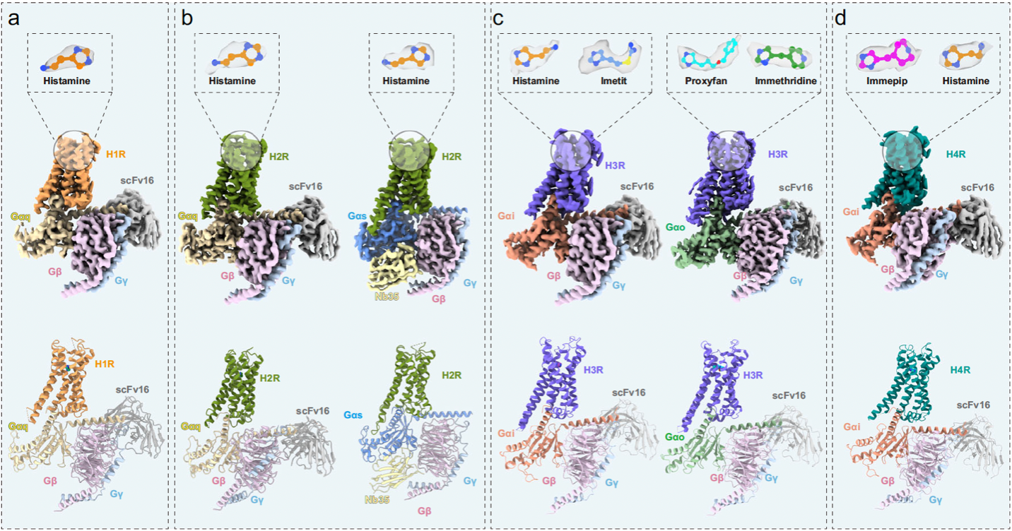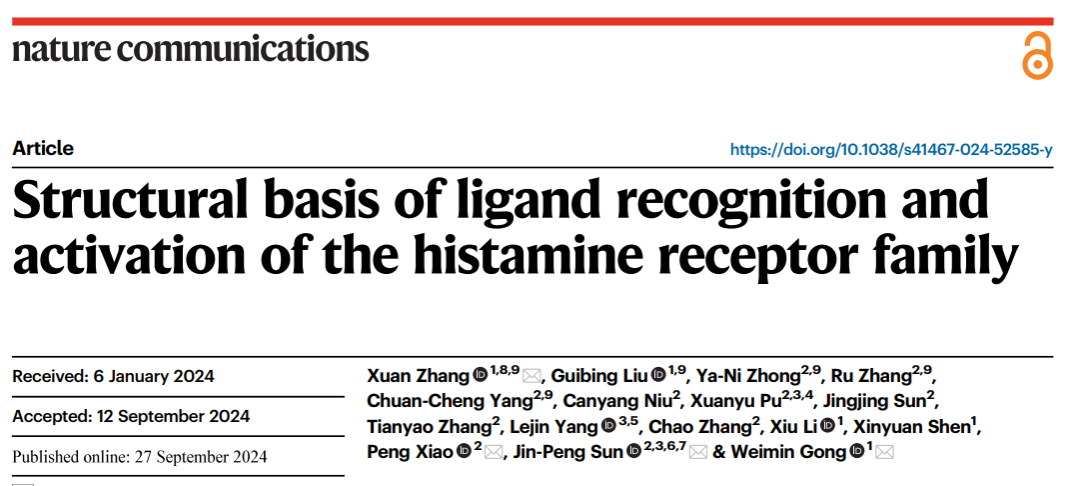 2024年9月27日,中国科学技术大学龚为民课题组与山东大学孙金鹏课题组合作在Nature Communications杂志在线发表了题为Structural basis of ligand recognition andactivation of the histamine receptor family的研究论文,系统报道了在内源性组胺或其他合成配体存在下,四种组胺家族受体亚型与四种不同的下游 G 蛋白复合的九种低温电子显微镜 (cryo-EM) 结构。该研究为理解所有四种组胺受体的配体识别和 G 蛋白偶联提供了一个结构框架,这可能有助于合理设计针对这些受体的配体。