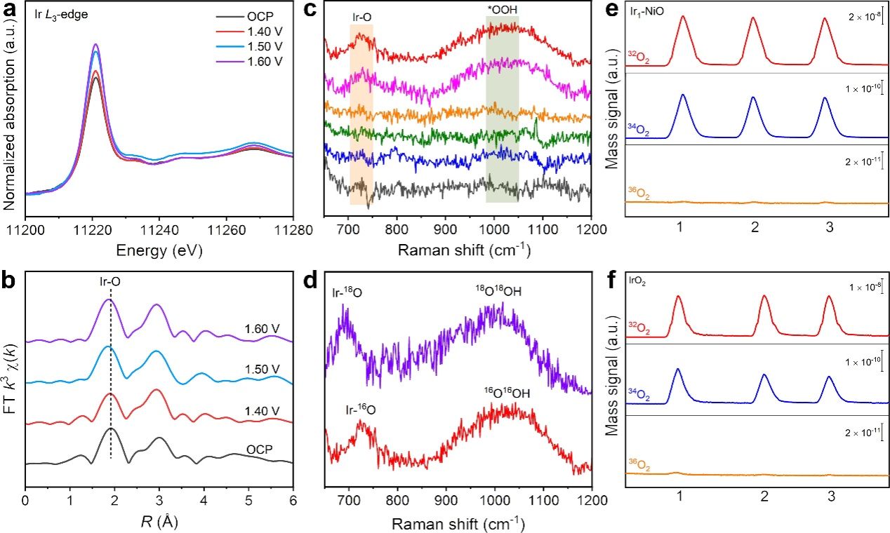 研究人员随后对此现象进行了电化学原位谱学和理论计算研究。原位拉曼光谱研究表明,铱单原子是Ir1-NiO催化剂发生阳极水氧化反应的主要活性位点。理论计算结果表明,Ir1-NiO的高活性归因于Ir1-NiO减弱了对*OOH中间体的吸附,使得反应决速步的能垒最低。此外,Ir1-NiO的dz2轨道能量和电子数更高,导致了Ir1-NiO结合*OOH中间体的铱-氧键更弱,从而减弱了对*OOH的吸附,从而提高了阳极水氧化的活性。