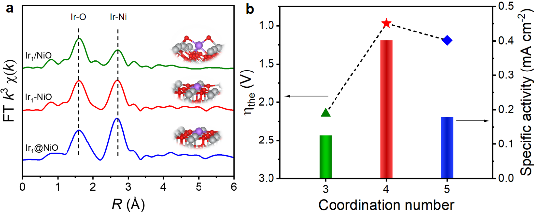 在本工作中,研究人员通过设计不同的键合策略,创制了三种具有不同铱原子第二壳层配位数的氧化镍负载的铱单原子催化剂,铱单原子第二壳层铱-氧-镍配位数分别为3,4,5。电化学测试表明,铱第二壳层配位数为4的Ir1-NiO催化剂表现出最优异的活性,在过电势300毫伏时,可以达到0.4毫安每平方厘米的本征电流密度,分别是Ir1/NiO催化剂和Ir1@NiO催化剂的3.1和2.2倍,催化活性和铱-氧-镍配位数之间呈现火山型的关系。