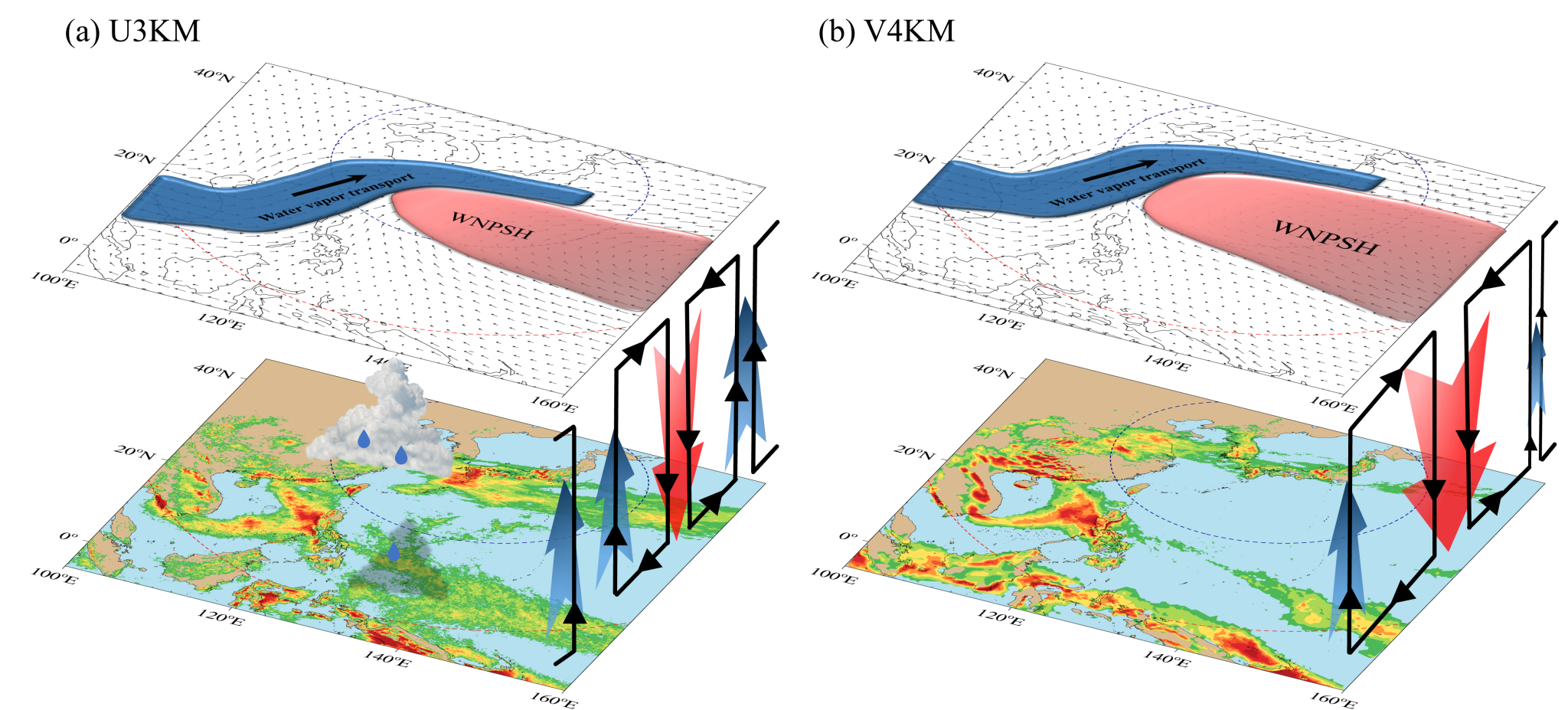 更进一步的研究发现,全球对流解析模式能够有效捕捉到赤道地区的深对流, 并合理模拟出与观测数据接近的西太平洋赤道地区的降雨过程及其环流形势。这种合理的赤道降雨过程和环流场再现了副热带高压的强度和位置,进而影响到中纬度地区的环流,包括其下沉和上升位置,从而成功地预测了此次梅雨事件的强度和位置(图2)。