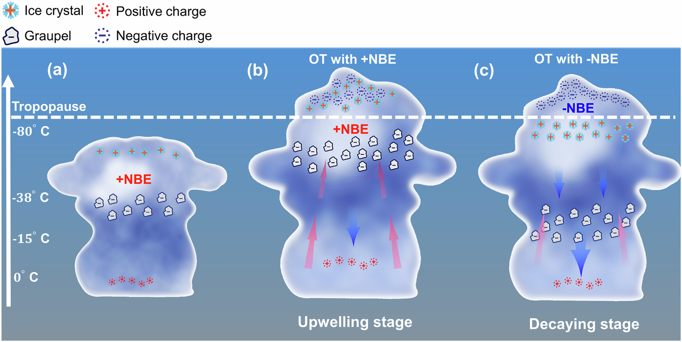 近期,研究团队基于自主研制的新一代地基闪电观测平台, 利用闪电低频信号通过电离层反射的信息,观测到台风登陆期间发生在外雨带云顶的NBE爆发现象,首次发现云顶不同极性NBE之间表现出很强的“竞争性”关系。对表征云内对流发展的雷达资料进行分析,结果表明,过冲云中对流发展阶段对云顶放电的产生起到主导作用,表现为爆发性正NBE总是发生在过冲云的对流抬升阶段,而云顶负NBE通常爆发性产生在过冲云的对流下沉阶段,并总伴随着平流层“云上卷云”的形成。进而,研究团队从云内对流发展的角度出发,提出了对流强度主导云顶放电产生的新概念模型,即对流抬升程度所调制的不同电荷层高度变化主导了云顶放电的产生(图2)。