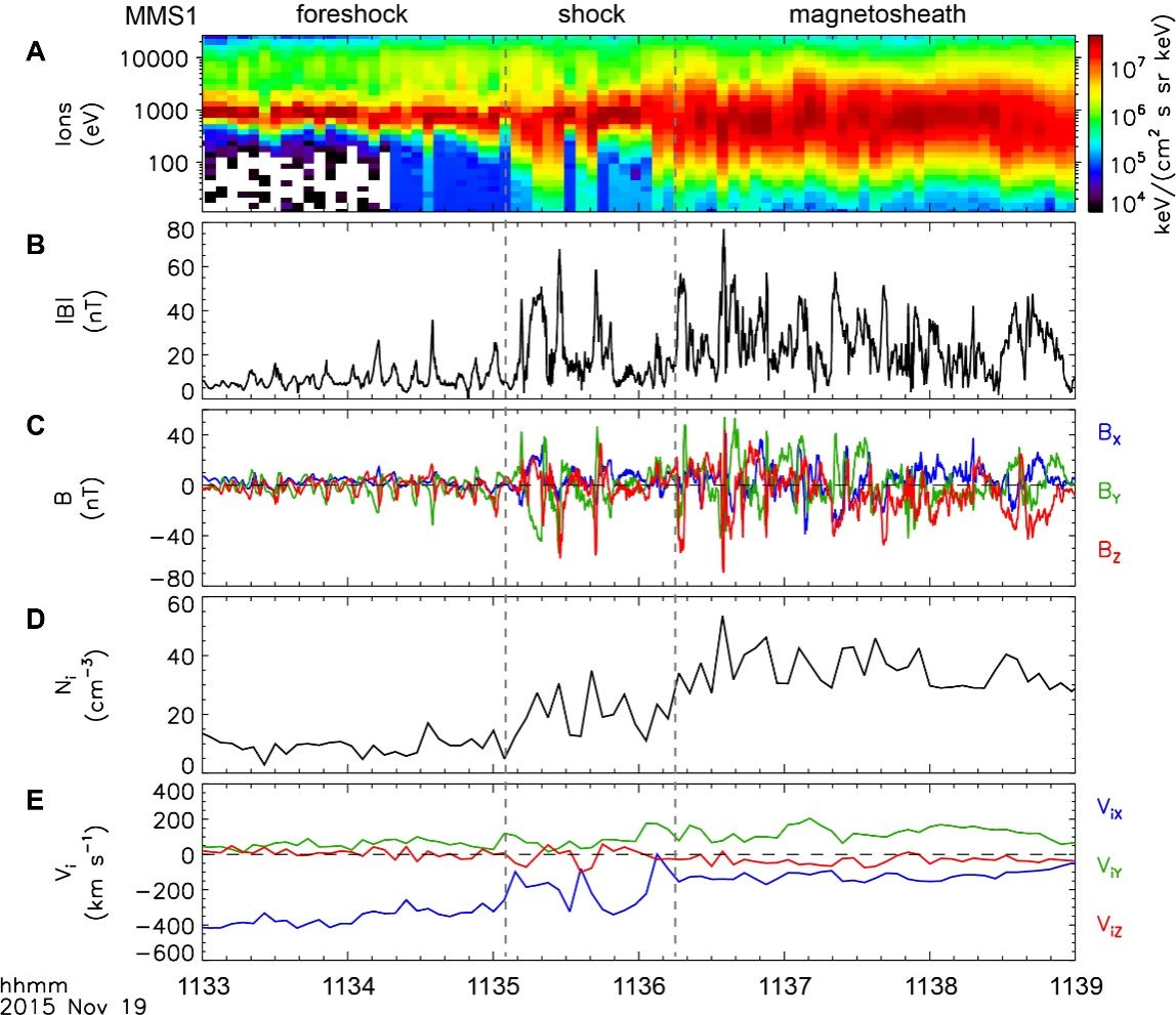 图1:激波上游波动演化的卫星观测结果。从上到下分别为离子能谱、磁场强度、GSE坐标系中磁场三分量、离子数密度和离子速度矢量。