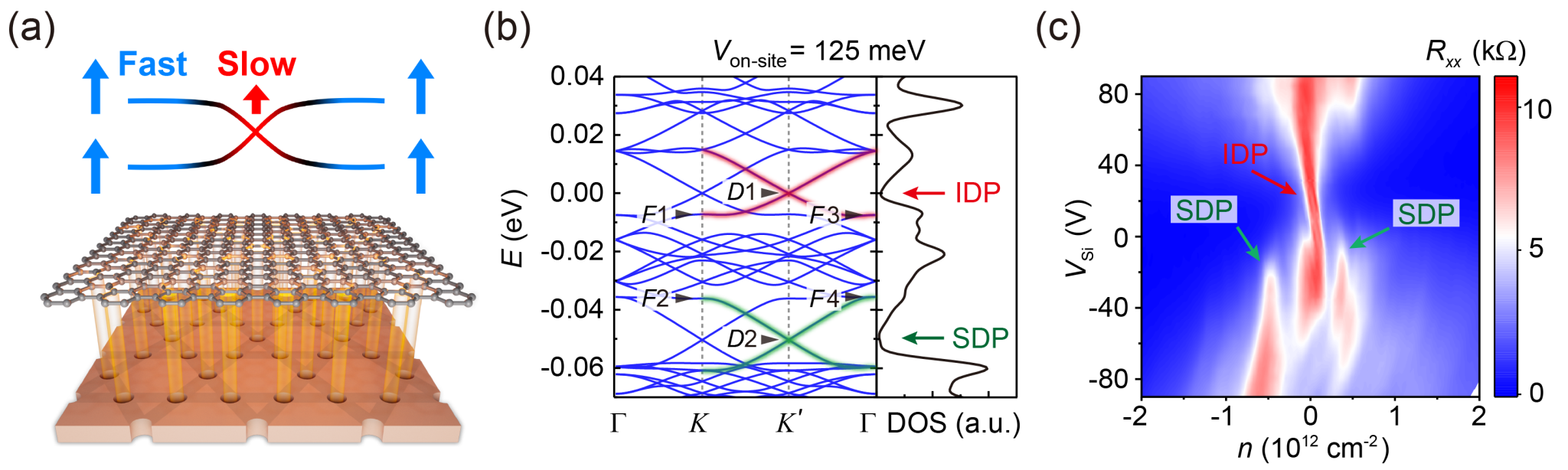 图示:(a)人工笼目超晶格及色散选择型能带调控示意图;(b)超晶格能带中的线性色散能带分量(D1、D2)及平带分量(F1-F4);(c)随着超晶格势场调制,本征狄拉克能带(IPD)消失,卫星狄拉克能带(SDP)增强。
