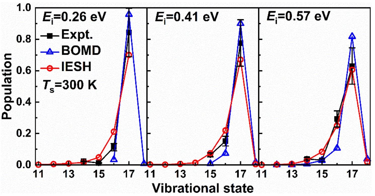 为了解决这一问题,研究团队提出了“约束密度泛函理论+嵌入原子神经网络+独立电子面跳跃”的模拟策略,并将该策略用于CO分子从Au(111)表面散射过程中的能量转移动力学模拟。如图1所示,研究人员首先用约束密度泛函理论计算了众多构型的CO分子在金属表面的电子转移透热态,并用嵌入原子神经方法拟合相应的全维势能面,最后用独立电子面跳跃方法模拟分子散射过程中的能量转移过程。研究结果显示,独立电子面跳跃模拟得到的高振动态CO(vi=17)分子散射后的振动末态分布与实验很接近(图2),低振动态CO(vi=2)散射后的振动弛豫概率、平均平动能以及散射角分布也都被理论模拟比较好地重现了(图3)。特别值得一提的是,模拟结果还揭示了不同初始振动态下不同的能量传递通道:在高初始振动态下,分子振动能主要传递到表面电子和分子平动,而在低初始振动态下,分子振动能则只传向表面电子。这一系列的发现对于理解分子-表面体系的能量传递过程有着重要的意义。此外,这套模拟策略有望用于研究一些复杂过程的能量转移动力学,比如光/电化学和等离激元催化过程。