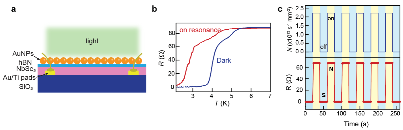 图示:(a)等离激元金纳米颗粒与二维超导体复合器件示意图;(b)等离激元共振激发下,观测到超导温度的显著调控;(c)等离激元超导开关操作。